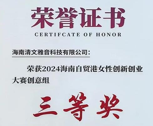 喜报!清文雅音科技获得2024海南自贸港女性创新创业大赛三等奖